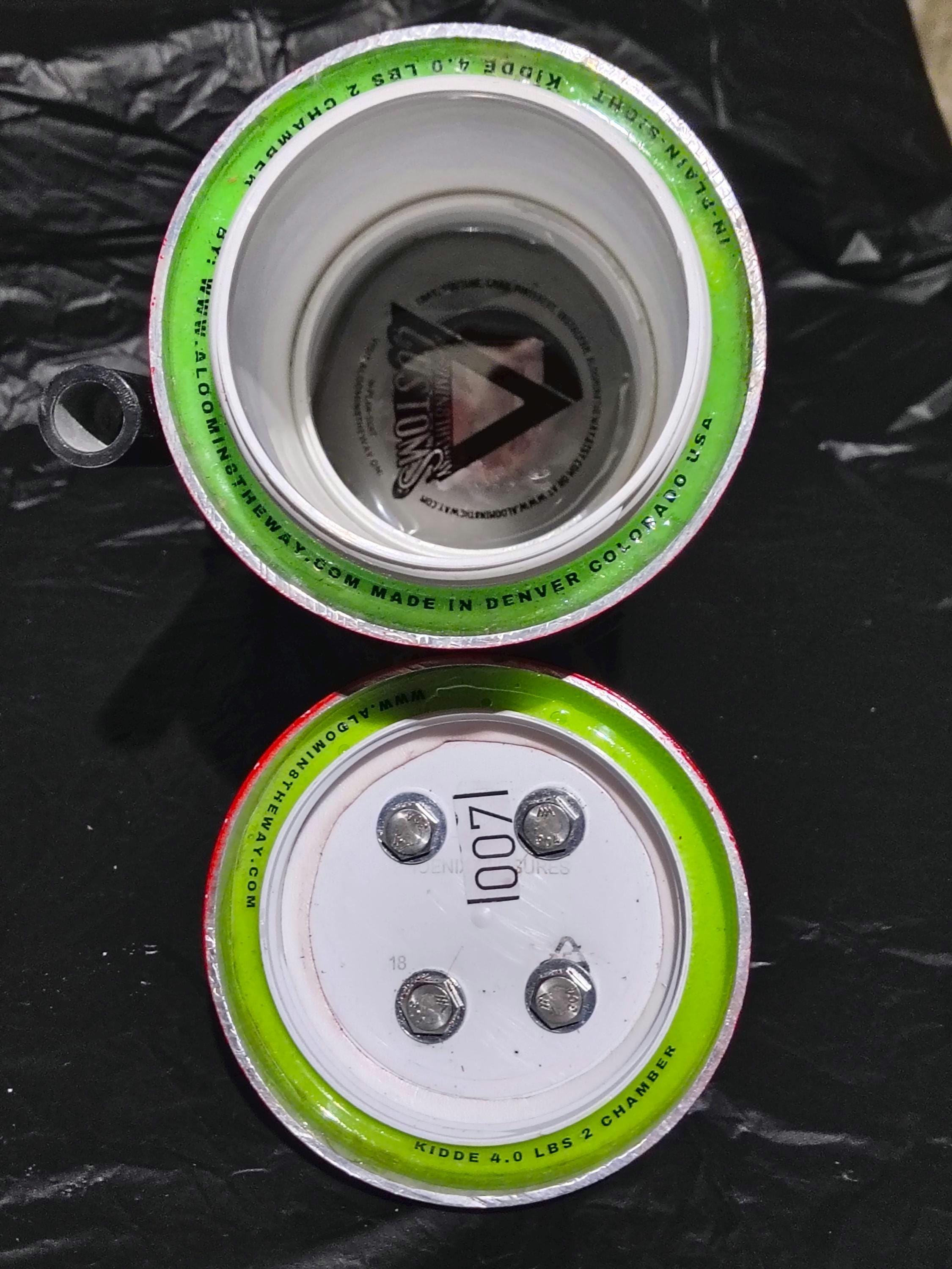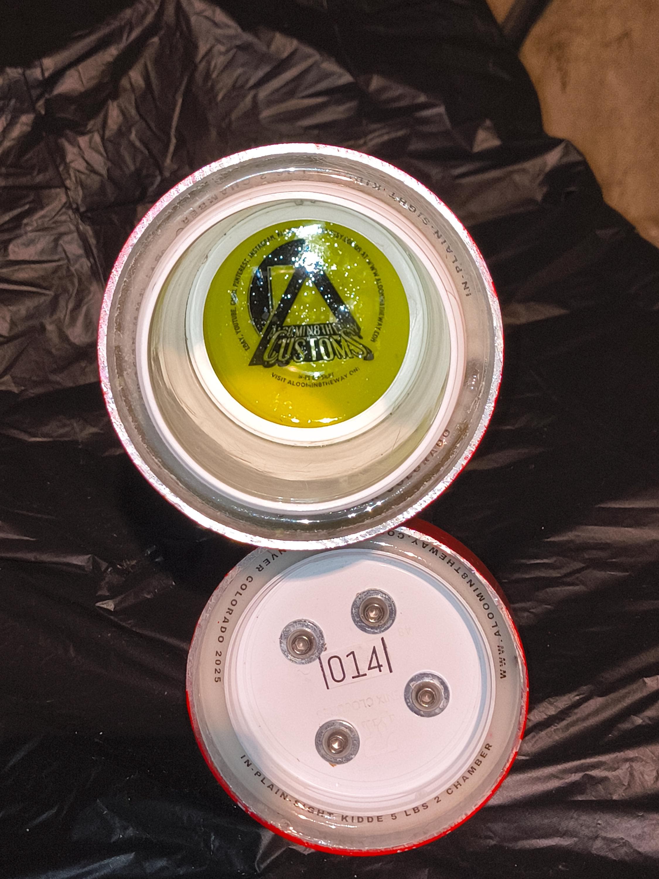 The First, Always is located directly underneath the extinguishers Smell Proof sealled trigger handle. Attached to the handle is the fixed pressure gauge that's been disassembled, and manipulated to read full and then was set in epoxy resin, to assure it always reads full. Unscrew the handle and you will find your first smell proof chamber. this chamber is New Standerd Round 2" x 2" container or something very similer That's cased in reinforced concrete.
