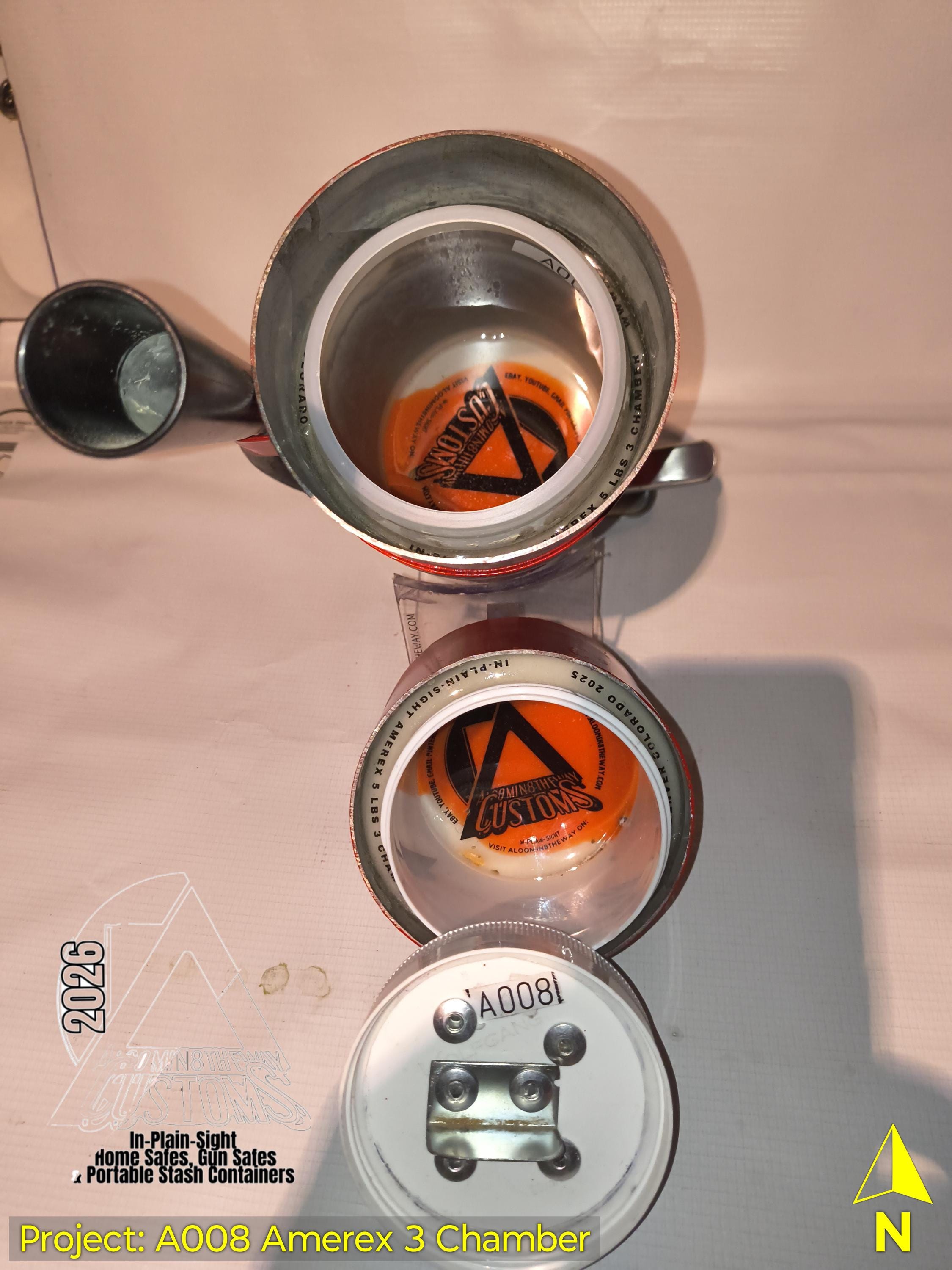 Chamber 2 & 3 are 2 HDPE Containers 3.75" long and 3.75" Wide. That are attached at the lids by either stainless steel rivets/metal rivets/1/4 Bolts and nuts. the EXTINGUISHERs hose strap conveniently covers up the seam where it opens. Removing the third chamber as you unscrew the bottom 3-5 inches off. giving you access to Chamber two and three. (**three chambers are not available with locks at the moment)